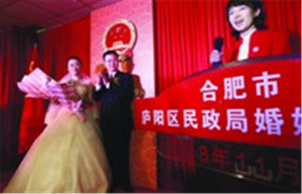 到婚姻登记处去办结婚证,在那连婚礼也一道办了吧。昨日上午,在合肥市庐阳区婚姻登记处,一场特殊的婚礼在这里举行,一对新人仅用了一上午时间,就领了证、办了婚礼,而婚礼更是不到20分钟。这可是我省首个在婚姻登记机关举办的婚礼。省、合肥市民政部门有关负责人都表示,这种“婚礼式颁证”是倡导新婚俗的探索。
