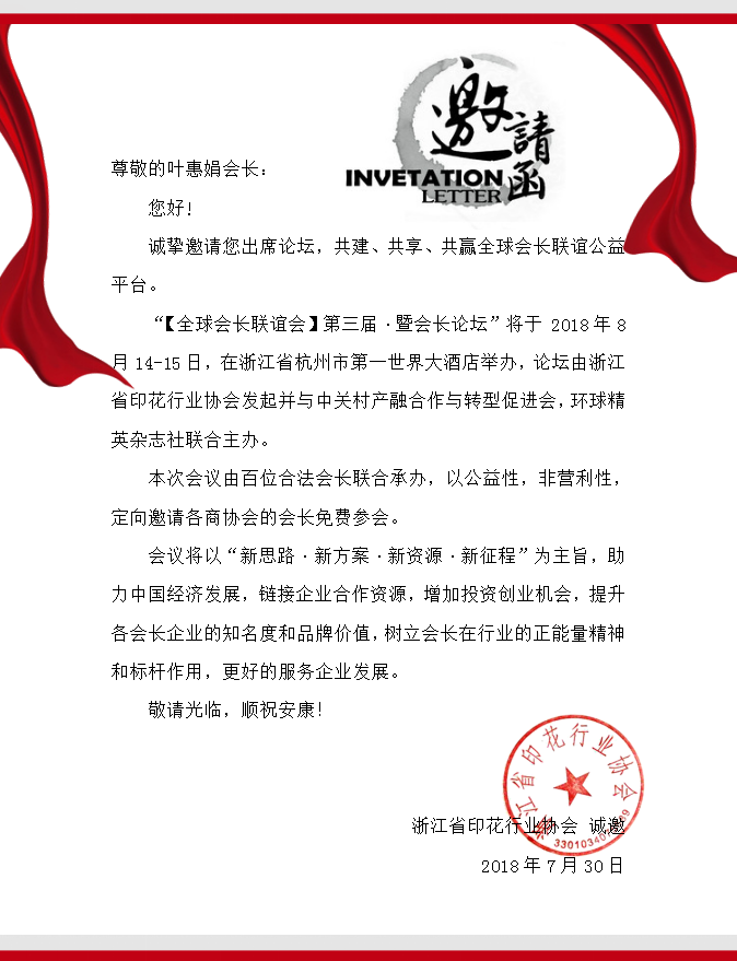2018年8月14日至8月16日为期三天的“全球会长联谊会第三季暨会长高峰论坛”在杭州第一世界大酒店隆重举行。会长高峰论坛开幕式由浙江省印花行业协会詹宏伟会长主持。本次全球会长联谊会多个主题论坛由聚众涪商会与全球会长联谊会联合发起召开。本次论坛由中央电视台《中华商邦》、中关村产融合作与转型促进会、同济大学商会行业协会发展研究中心、天九共享网络科技集团有限公司、浙江省印花行业协会联合主办,并得到了中国社会工作联合会企业公民委员会、浙江省高新技术企业协会、陕西爱国主义促进会、中国婚庆文化产业园的大力支持。