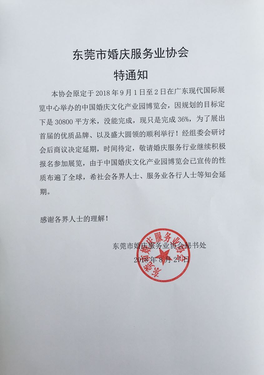 中国婚庆文化产业园博览会致期顺延特通知