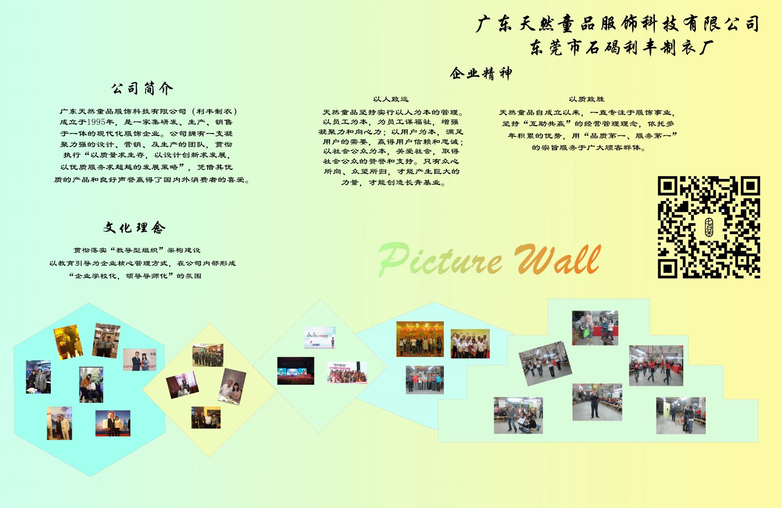 广东天然童品服饰科技有限公司(利丰制衣)成立于1995年,是一家集研发、生产、销售于一体的现代化服饰企业。公司拥有一支凝聚力强的设计、营销、及生产的团队,贯彻执行“以质量求生存,以设计创新求发展,以优质服务求超越的发展策略”,凭借其优质的产品和良好声誉赢得了国内外消费者的喜爱。